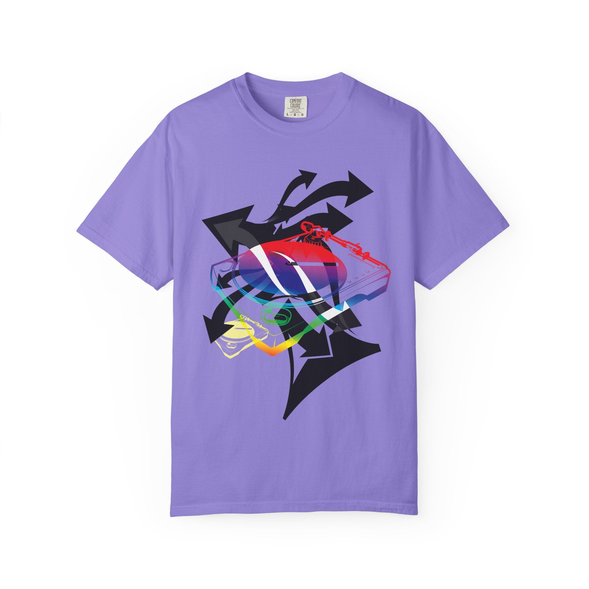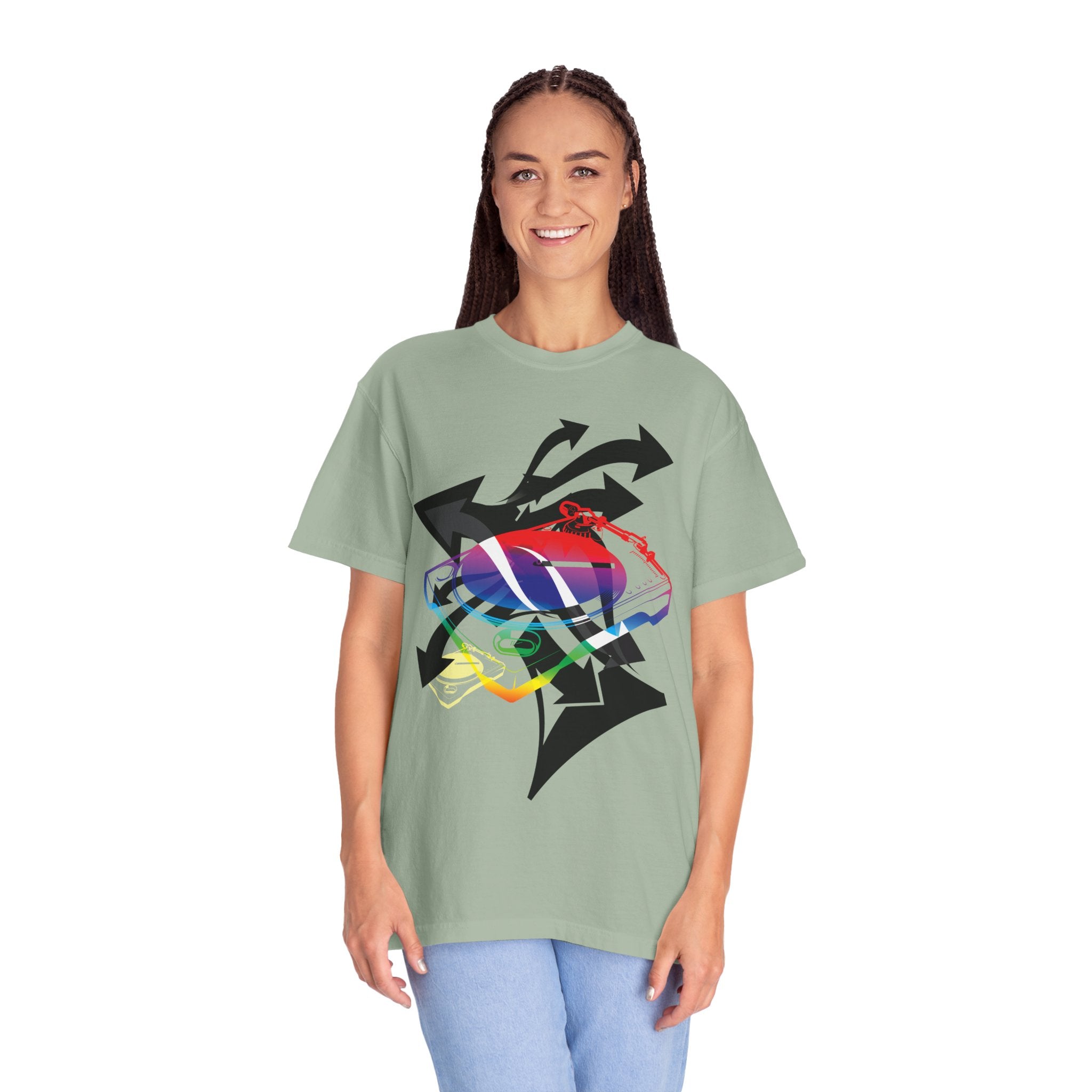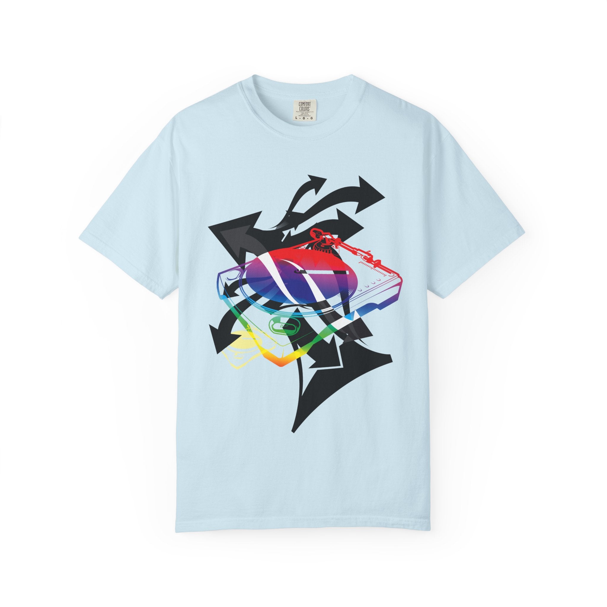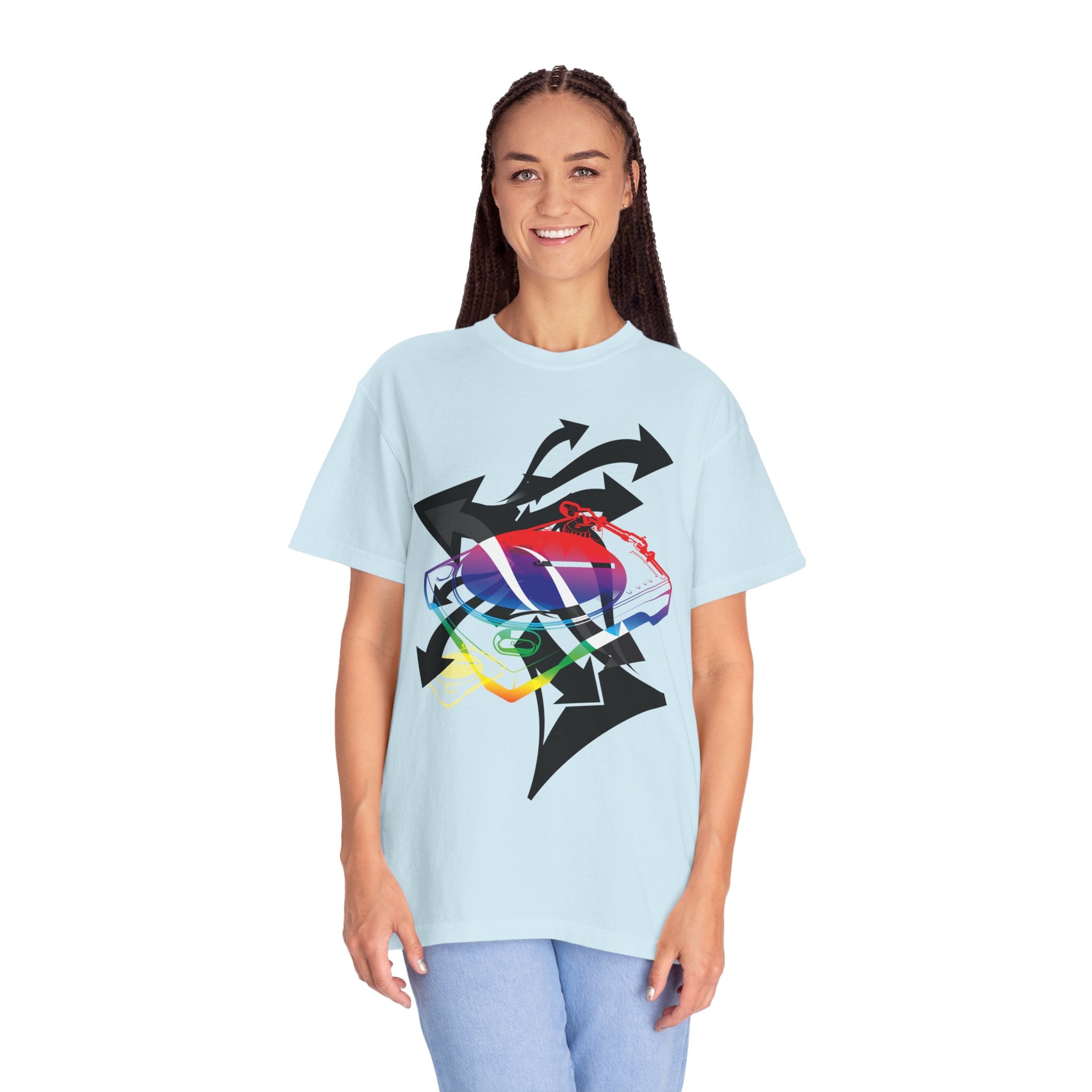 A soft, garment-dyed tee that blends playful street energy with subtle retro colorwork. A layered graphic — a stylized sneaker washed in rainbow hues and framed by bold directional arrows — sits centered on a relaxed white tee, giving casual outfits an offbeat, expressive focal point. The medium-weight cotton feels lived-in from the first wear; the relaxed fit and tubular knit let it hang easily over jeans or layered under a jacket. Wear it when you want to nod to skate and sneaker culture without shouting, or bring a splash of color to a low-key day out or an evening at a show.