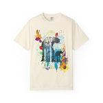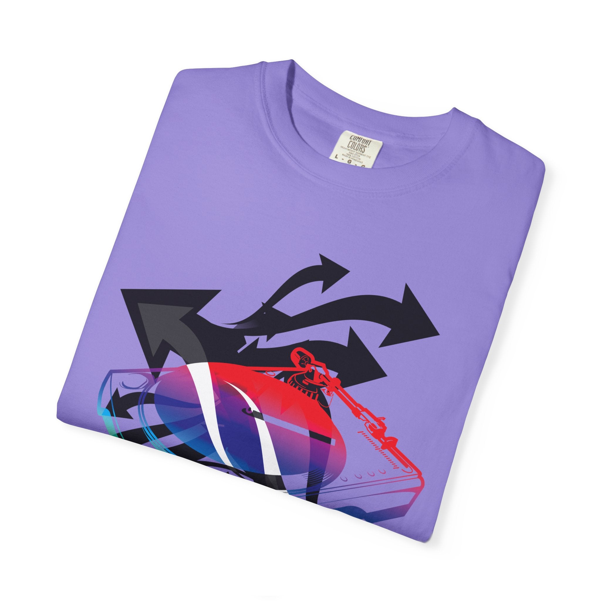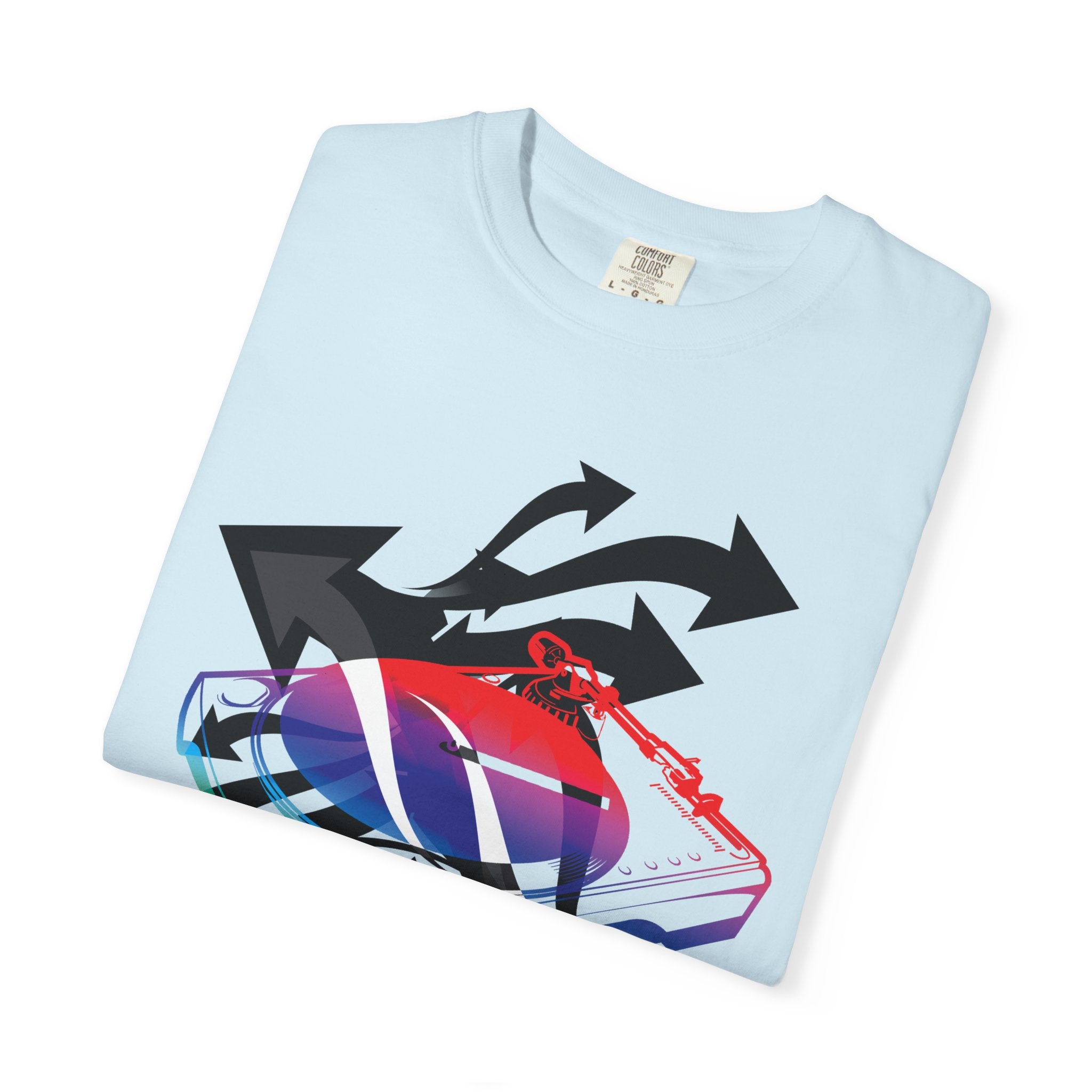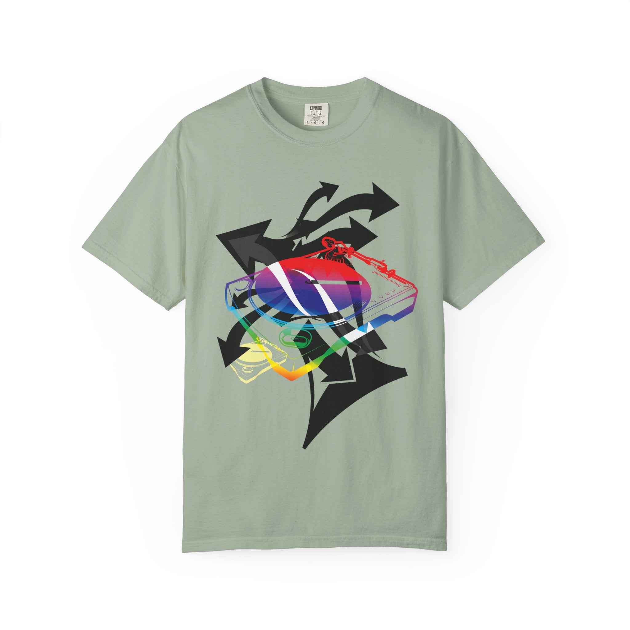 A soft, garment-dyed tee that blends playful street energy with subtle retro colorwork. A layered graphic — a stylized sneaker washed in rainbow hues and framed by bold directional arrows — sits centered on a relaxed white tee, giving casual outfits an offbeat, expressive focal point. The medium-weight cotton feels lived-in from the first wear; the relaxed fit and tubular knit let it hang easily over jeans or layered under a jacket. Wear it when you want to nod to skate and sneaker culture without shouting, or bring a splash of color to a low-key day out or an evening at a show.
